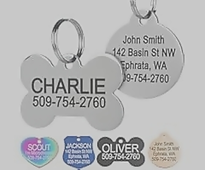 Personalized stainless steel pet ID tags with up to 8 lines of custom text, engraved on both sides for durability.