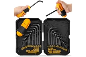 The ELEAD 31-Piece Hex Key Set is a comprehensive collection of both SAE and Metric Allen wrenches designed for versatility and durability. Each key is crafted from heat-treated steel, ensuring longevity and resistance to bending or breaking under torque. With sizes ranging from 0.7mm to 10mm in metric and 0.028" to 3/8" in SAE, this set meets a variety of fastening needs. The ergonomic design provides a comfortable grip, making it easier to apply torque and work efficiently. Perfect for both professional and home use, this set is a must-have for any toolbox.