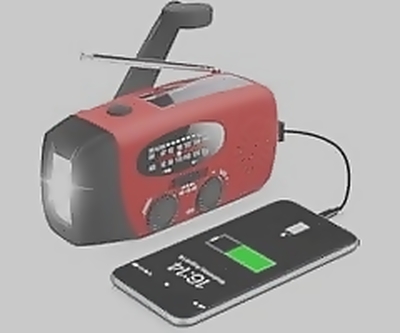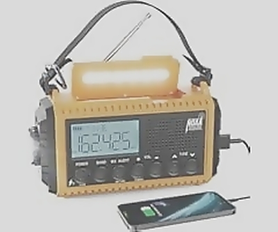 Versatile emergency radio with solar and hand crank charging, NOAA alerts, and phone charging capabilities.
