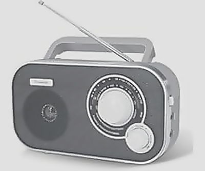 Portable AM FM Radio with strong reception and sound, operates on wall or battery power, featuring a large easy-to-read dial.