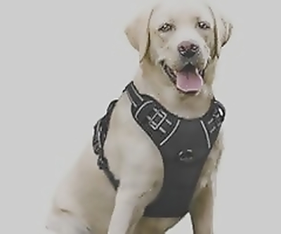 Adjustable, no-pull dog harness with soft padding and reflective material for safety.