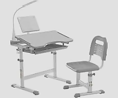 Ergonomic, height-adjustable desk and chair set for kids with tilt desktop and built-in book stand for optimal study comfort.