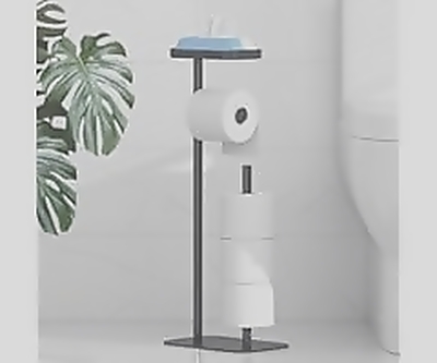 Rustproof metal free-standing toilet paper holder for 4 rolls with anti-slip base and shelf.
